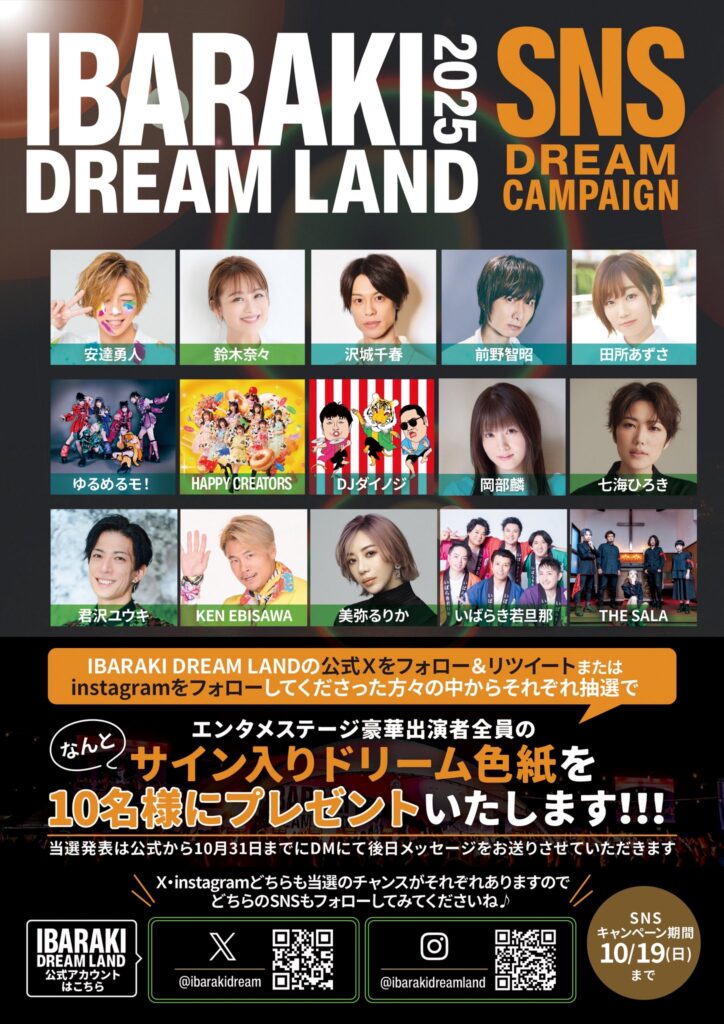 10/19(日)までにこのIBARAKI DREAM LAND公式Xをフォロー&リツイート、または公式インスタをフォローしてくださった方々の中から抽選で10名様に豪華出演者全員の直筆サイン入りドリーム色紙をなななんとプレゼン